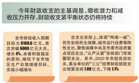 在財政收支依然嚴(yan) 峻的情況下,“緊平衡”態勢也呈現出與(yu) 以往財政收入零增長、負增長不同的態勢。吳素芳介紹,2022年的“緊平衡”,主要體(ti) 現為(wei) 收入回歸常態運行,但各領域資金需求快速增長。財政部門要堅決(jue) 貫徹落實中央經濟工作會(hui) 提出的“積極的財政政策要提升效能,更加注重精準、可持續”工作要求,通過調結構、盤存量、抓統籌、保重點等方式做好保障。在支出安排上,體(ti) 現“兩(liang) 增一減”:優(you) 先安排民生保障、城市運行經費等剛性支出,聚焦保障中央及市委市政府重點項目支出,“從(cong) 嚴(yan) 從(cong) 緊”安排部門常規履職支出。其中,2022年市級黨(dang) 政機關(guan) 、事業(ye) 單位的“三公”經費財政撥款支出預算安排7.09億(yi) 元,下降1.1%。