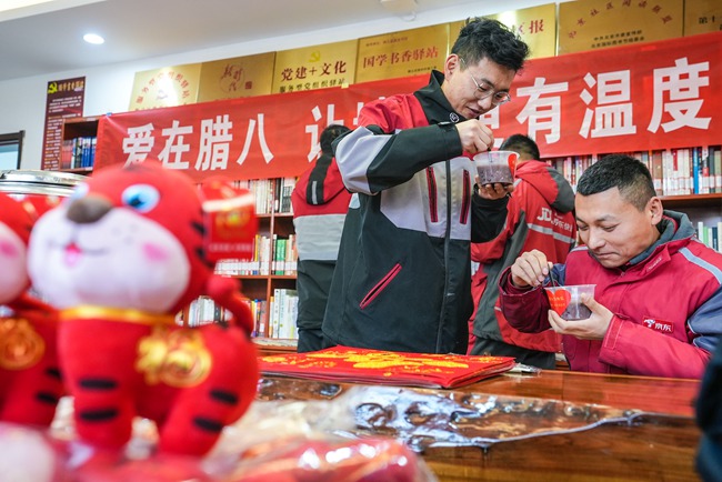 人民網北京1月8日(池夢蕊 閆兆鬆)1月7日,盡管天氣非常寒冷,但是在位於(yu) 順義(yi) 區勝利街道建北一社區的“小哥驛站”裏卻是歡聲笑語、暖意洋洋。原來,由順義(yi) 區勝利街道非公企業(ye) 聯合會(hui) 黨(dang) 支部、建北一社區黨(dang) 總支聯合舉(ju) 辦的“愛在臘八,讓城市更有溫度”主題活動正在這裏暖心舉(ju) 行。一碗碗熱氣騰騰、香甜四溢的臘八粥為(wei) 正在這裏臨(lin) 時休息的快遞小哥送去濃濃的關(guan) 愛。勝利街道工委副書(shu) 記、辦事處主任張家豐(feng) 、工委副書(shu) 記薛靜、組織部長石曉靜、建北一社區黨(dang) 總支書(shu) 記顧濤以及夏禾拉麵、更讀書(shu) 社、順批醫藥等愛心單位代表參與(yu) 了本次公益活動。