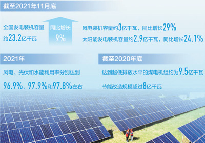近年來,我國風電、光伏等可再生能源裝機規模持續擴大。截至2021年11月底,全國發電裝機容量約23.2億(yi) 千瓦,同比增長9%。其中,風電裝機容量約3億(yi) 千瓦,同比增長29%;太陽能發電裝機容量約2.9億(yi) 千瓦,同比增長24.1%。