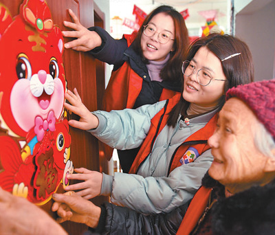 近日,安徽省當塗縣五彩社會(hui) 工作服務中心的誌願者與(yu) 空巢老人一起貼年畫,為(wei) 老人家增添節日喜慶氣氛。