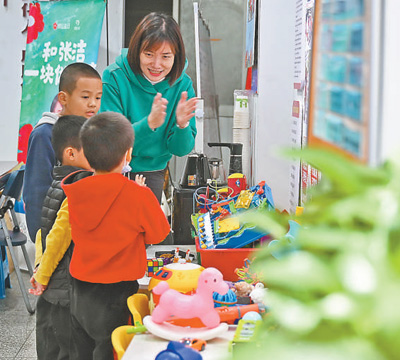 在福建省福州市晉安區鼓山鎮“村童媽媽聚樂(le) 部”誌願服務站,誌願者張潔在教小朋友唱歌。