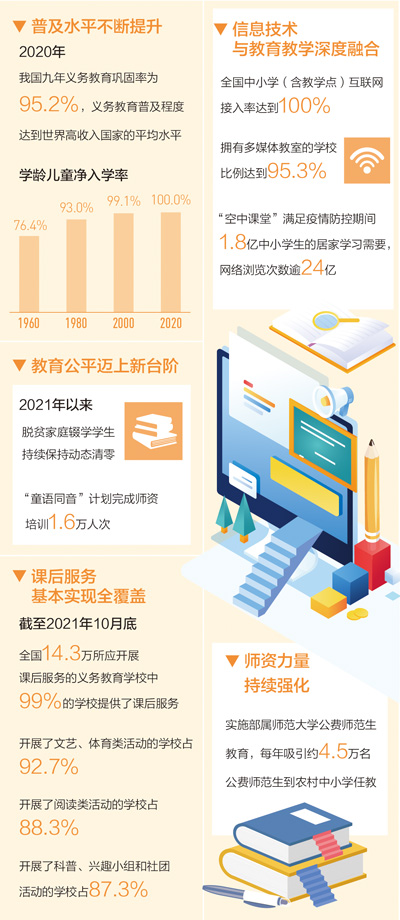 黨(dang) 的十八大以來,在以習(xi) 近平同誌為(wei) 核心的黨(dang) 中央堅強領導下,我國義(yi) 務教育取得了舉(ju) 世矚目的成就:2020年,我國九年義(yi) 務教育鞏固率為(wei) 95.2%,義(yi) 務教育普及程度達到世界高收入國家的平均水平;實施義(yi) 務教育薄弱環節改善和能力提升項目,發展“互聯網+”教育助力城鄉(xiang) 教育均衡,全國義(yi) 務教育基本均衡已經全麵實現……讓適齡兒(er) 童少年有學上、上好學,讓每個(ge) 孩子都能享有公平而有質量的教育,正在成為(wei) 現實。