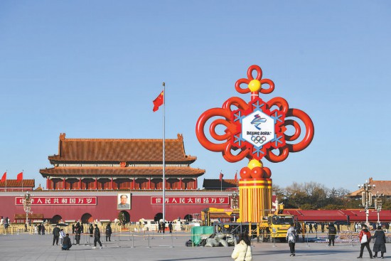 昨天,天安門廣場又添新景。一個(ge) 鑲嵌有2022冬奧會(hui) 會(hui) 徽的巨型中國結正在安裝。中國結整體(ti) 呈紅色,中心鑲嵌一片藍白相間的雪花,雪花正中是2022冬奧會(hui) 會(hui) 徽,為(wei) 迎接春節和冬奧營造喜慶氛圍。 本報記者 鄧偉(wei) 攝