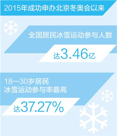 本報北京1月12日電 (記者陳晨曦、季芳、李洋)1月12日,國家體(ti) 育總局委托國家統計局開展的“帶動三億(yi) 人參與(yu) 冰雪運動”統計調查發布報告。數據顯示:2015年成功申辦北京冬奧會(hui) 以來,全國居民冰雪運動參與(yu) 人數達3.46億(yi) ,提前實現了“帶動三億(yi) 人參與(yu) 冰雪運動”的目標。