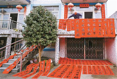 “和順一門有百福 平安二字值千金”……1月13日上午,在寧波寧海縣黃壇鎮永聯村村民王光彬家中,房間裏飄散著濃濃的墨香,幾百副春聯鋪天蓋地,從(cong) 牆上蔓延到地上,掛得密密麻麻。