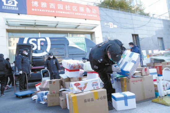 昨天上午,海澱區上地街道博雅西園社區門口,工作人員在幫社區居民轉運快遞。本報記者 王海欣攝