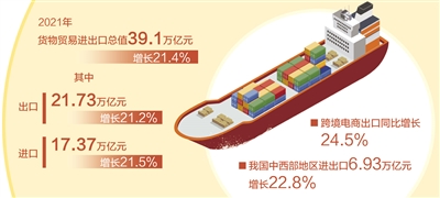 “跨境電商、市場采購等新業(ye) 態新模式是我國外貿發展的有生力量,也是國際貿易發展的重要趨勢。新冠肺炎疫情發生以來,我國跨境電商發揮在線營銷、在線交易、無接觸交付等特點優(you) 勢,積極培育參與(yu) 國際合作和競爭(zheng) 的新優(you) 勢,進出口規模持續快速增長。”李魁文表示,2021年我國跨境電商進出口規模達到1.98萬(wan) 億(yi) 元,增長15%;市場采購出口增長32.1%。