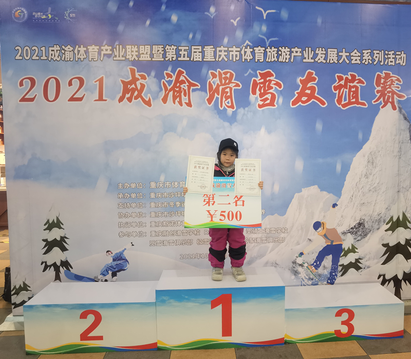2021年夏天,萱萱迎來了第一場比賽——成渝滑雪友誼賽女子少年(U12)組比賽。當時4歲的萱萱是全場最小的參賽者,其他和她同台角逐的都是8到12歲的小朋友。在平行回轉和坡麵障礙兩(liang) 個(ge) 項目中,萱萱捧回了兩(liang) 個(ge) 第二名。