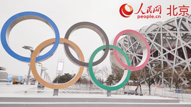位於(yu) “鳥巢”西側(ce) 的“奧運五環”形象景觀。 人民網 李博攝