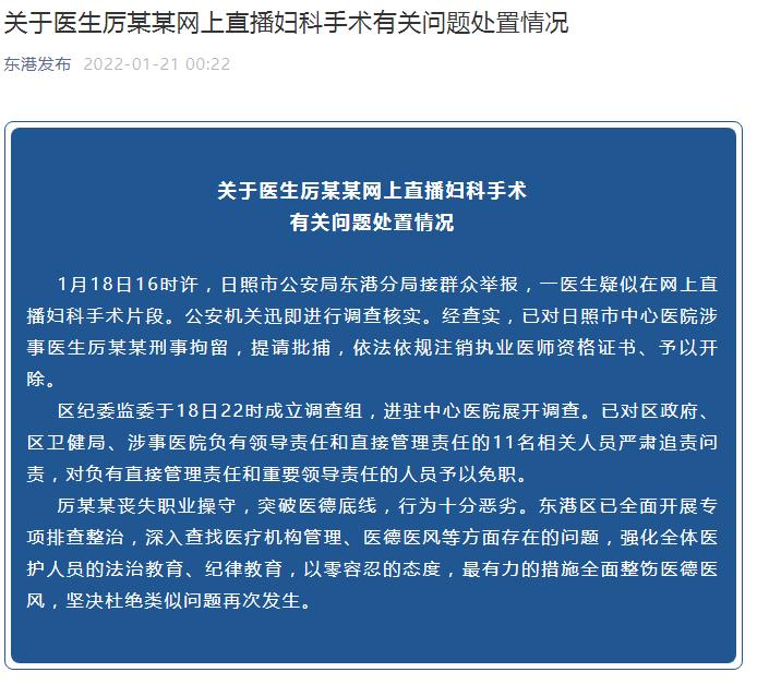 人民網日照1月21日電(聶俊穹)1月21日,山東(dong) 省日照市東(dong) 港區委宣傳(chuan) 部發布通報稱:1月18日16時許,日照市公安局東(dong) 港分局接群眾(zhong) 舉(ju) 報,一醫生疑似在網上直播婦科手術片段。日照市公安機關(guan) 迅即進行調查核實。經查實,已對日照市中心醫院涉事醫生厲某某刑事拘留,提請批捕,依法依規注銷執業(ye) 醫師資格證書(shu) 、予以開除。