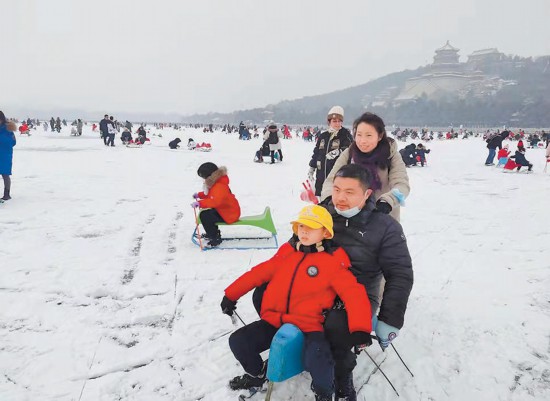 圖為(wei) 遊客在頤和園樂(le) 享冰雪運動。作為(wei) 第八屆北京市屬公園冰雪遊園會(hui) 活動內(nei) 容之一的頤和園“圓夢冬奧,相約頤和”項目,今年首次設置了雪上娛樂(le) 項目,讓市民不出京城就可親(qin) 身感受冰雪魅力。 本報記者 吳鏑攝