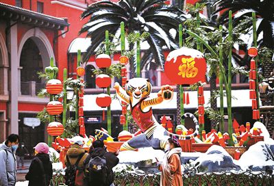 遍布園區的新春主題裝飾、全新推出的新春主題娛樂(le) 演出、充滿“年味”的限定美食……昨日,在紛紛揚揚的雪花中,北京環球度假區開啟了首個(ge) “環球中國年”季節性主題活動。即日起至2月20日,帶有春節特色的全新娛樂(le) 體(ti) 驗將伴隨遊客一起辭舊迎新,共同迎接虎年春節的到來。