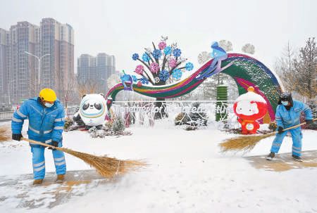 昨天,京城再度飄雪,在東(dong) 六環西側(ce) 路冬奧主題花壇附近步道上,環衛工在清除步道積雪。本報記者 方非攝
