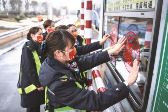 1月24日,在嘉興(xing) 高速南湖收費站,南湖“紅船”巾幗服務隊的收費員們(men) 裝扮著收費站,向排隊等候取卡的駕駛員發放“福”字、防疫包和車載垃圾袋,送上一份暖暖的關(guan) 愛。春節期間,收費員們(men) 將堅守崗位,用微笑服務春運,為(wei) 高速公路暢通保駕護航。(王振宇)