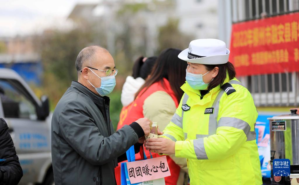 1月17日,在209國道廣西柳州市融安縣段“春運愛心驛站”,交通輔警為(wei) 司乘人員送薑糖茶。新華社發(譚克興(xing) 攝)