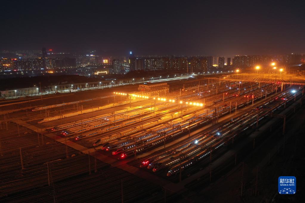 1月16日晚,動車組列車停靠在中國鐵路蘭(lan) 州局集團有限公司蘭(lan) 州車輛段蘭(lan) 州西動車運用所整備場上,為(wei) 1月17日開始的2022年春運做好準備(無人機照片)。新華社記者 杜哲宇 攝