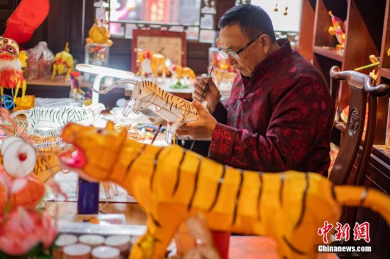 1月24日,南京秦淮花燈傳(chuan) 承藝人曹真榮正在趕製以“虎”為(wei) 主題的花燈。隨著農(nong) 曆虎年春節的臨(lin) 近,南京老城南一帶的民間花燈藝人加班加點趕紮花燈,迎接春節的到來。 中新社記者 泱波 攝