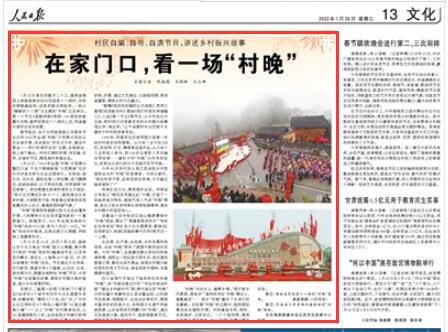 1月25日至26日,農(nong) 曆小年之際,國家公共文化雲(yun) 推出“村晚”接力雲(yun) 展播,集中展示《我的“村晚”我的年》融媒體(ti) 節目,以及來自內(nei) 蒙古、黑龍江、上海等20個(ge) 省(區、市)的30場精彩“村晚”活動。節目通過文化傳(chuan) 承、時代新風、展望未來3個(ge) 篇章,以訪談、互動、遊戲等方式,展播各地特色“村晚”節目、分享“村晚”台前幕後故事、展現鄉(xiang) 村振興(xing) 美好畫卷、推介鄉(xiang) 村美景好物。