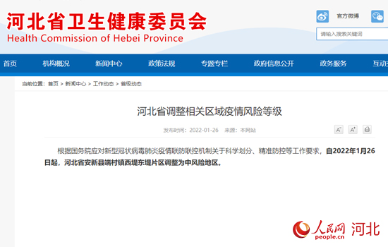 人民網石家莊1月26日電 據河北省衛健委官方網站消息,根據國務院應對新型冠狀病毒肺炎疫情聯防聯控機製關(guan) 於(yu) 科學劃分、精準防控等工作要求,自2022年1月26日起,河北省安新縣端村鎮西堤東(dong) 堤片區調整為(wei) 中風險地區。