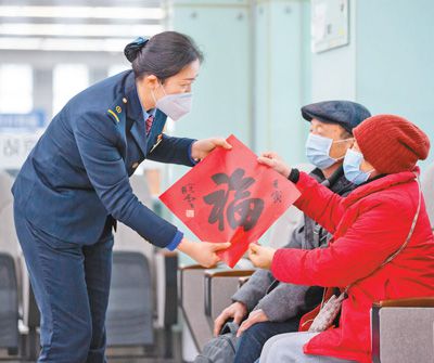 春運期間,南京火車站從(cong) 細節著手、小事出發,推出了一係列溫馨服務。“158”雷鋒服務站購置一批適合兒(er) 童使用的口罩,教孩子們(men) 如何正確佩戴,同時為(wei) 乘車旅客送上春聯、窗花或“福”字。圖為(wei) “158”雷鋒服務站客運值班員為(wei) 旅客送上新春祝福。