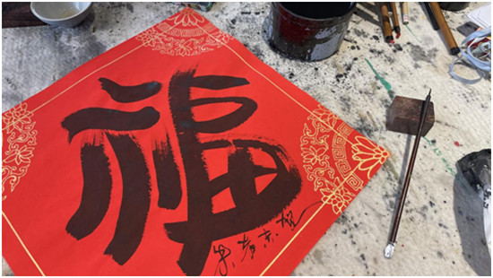 朱者赤是去年7月入駐藝術村的自由職業(ye) 藝術家,今年,他決(jue) 定留在林家村過年,他希望以送“福”的方式來表達自己真摯的祝福,與(yu) 村民們(men) 一起歡度春節。581幅各不相同的藝術“福”字,正是他送給村中581戶家庭的新年禮物。“入駐半年來,政府部門的關(guan) 心幫助和支持與(yu) 村民們(men) 熱情地問候讓我非常感動,我懷著感恩的心情,寫(xie) 下這581個(ge) 創意福字。”朱者赤說。