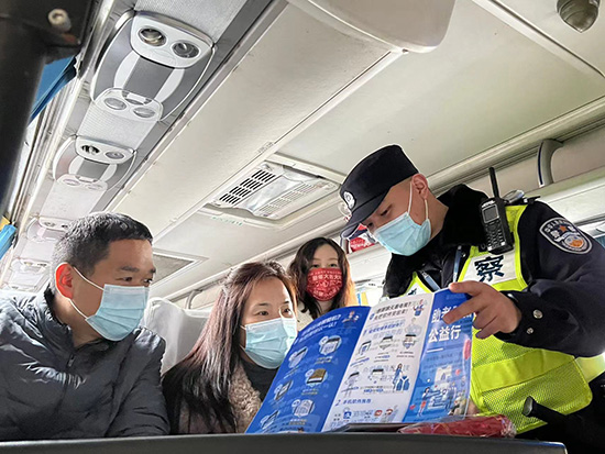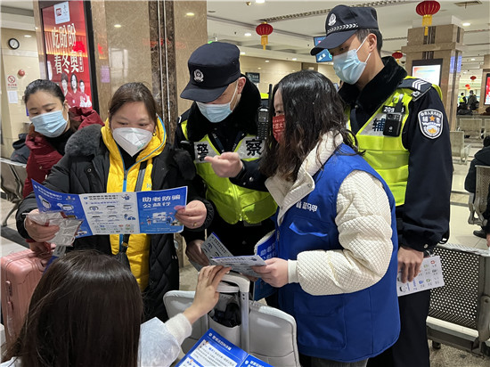 民警與(yu) 誌願者在汽車站做防騙宣傳(chuan) 。 人民網 王文娟攝