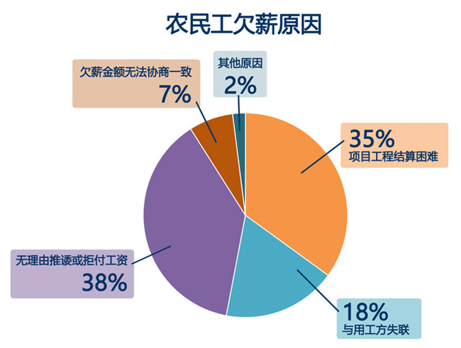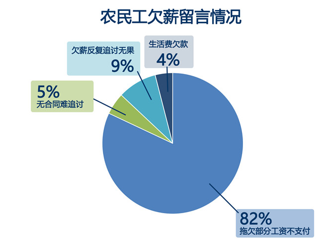 在群眾(zhong) 留言中,農(nong) 民工欠薪的情況大部分為(wei) 薪資未全額支付,這類占留言總數的約82%;無勞動合同、反複追討無果以及拖欠生活費的情況也有發生。項目工程結算困難、用工方推諉則是導致欠薪的主要原因。