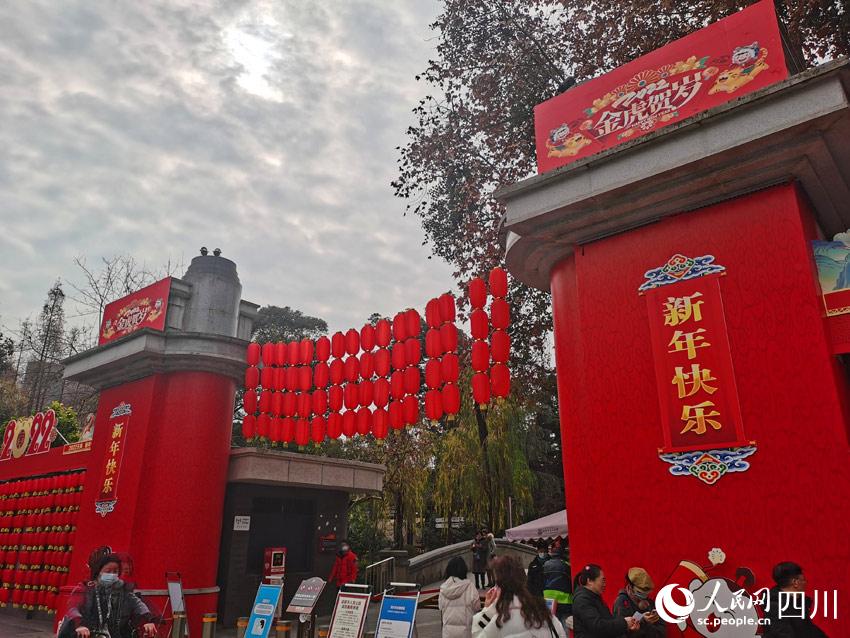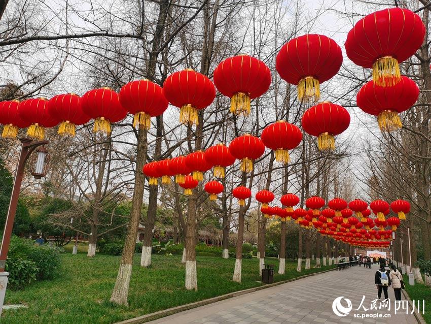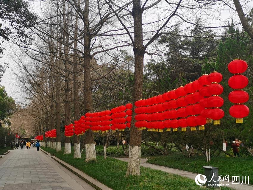 公園的大門布置成了喜慶的大紅色,門上門旁掛滿了紅燈籠。一串四個(ge) 紅燈,既可以理解為(wei) “四季平安”,也可以理解為(wei) “四季發財”,還可以理解成“四平八穩”……中國文化的詩意內(nei) 涵,可以激發出人們(men) 更多的想象力。