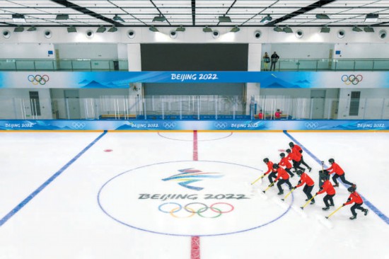 昨天上午,在冬奧冰球項目場地國家體(ti) 育館訓練場,清雪服務人員“雪童”練習(xi) 快速清雪,準備迎接比賽到來。 本報記者 鄧偉(wei) 攝
