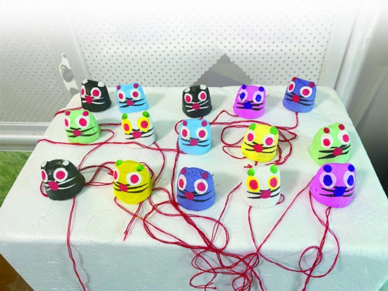 記者看到,吳為(wei) 民的老伴王培珍拎起兩(liang) 隻係著紅繩的“皮老虎”,熟練地倒置在顏料桶中,等到其身體(ti) 全部浸沒,立刻拿出,迅速掛在旁邊細長的竹竿上,三四天之後,方能上畫。隻見王培珍在模型上用自製毛筆畫了起來,不一會(hui) 兒(er) ,“皮老虎”胡須就出來了,最後用紅、白顏料分別點出“皮老虎”的眼白、眼珠和耳朵,一隻活靈活現的老虎就畫成了。