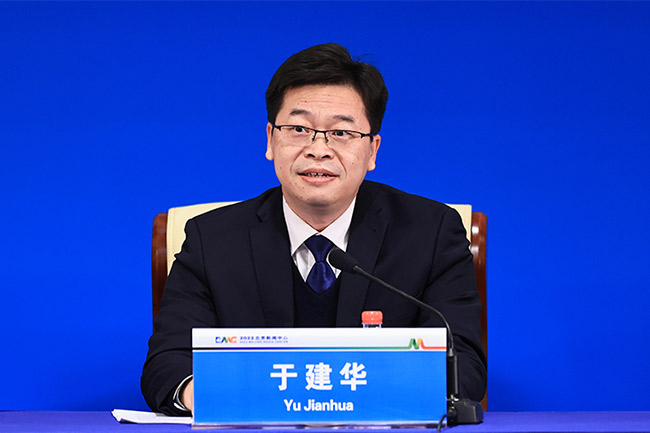 北京市生態環境局黨(dang) 組成員、副局長、新聞發言人於(yu) 建華介紹北京生態文明建設工作的整體(ti) 情況。2022北京新聞中心供圖
