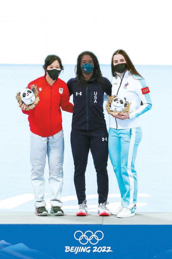 2月13日,北京2022年冬奧會(hui) 速度滑冰女子500米決(jue) 賽冠亞(ya) 季軍(jun) 選手合影。本報記者 鄧偉(wei) 攝
