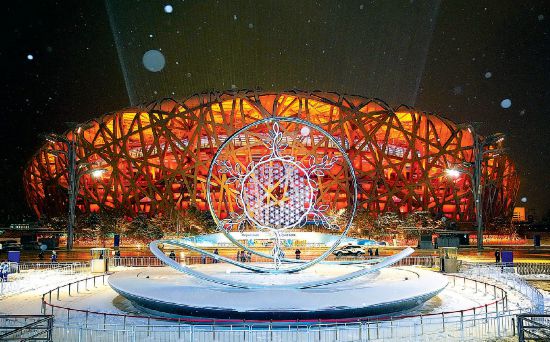 雪夜,北京賽區頒獎廣場“雪花”火炬展示台與(yu) 鳥巢交相輝映。 本報記者 方非攝