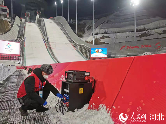 國家跳台滑雪中心電力保障團隊在賽事後檢查用電設備。 韓寶喜攝
