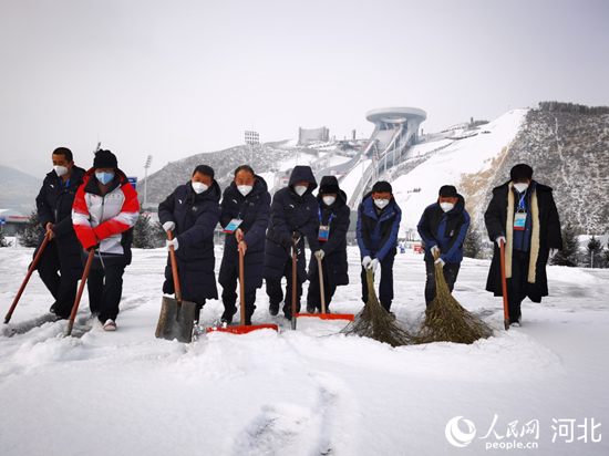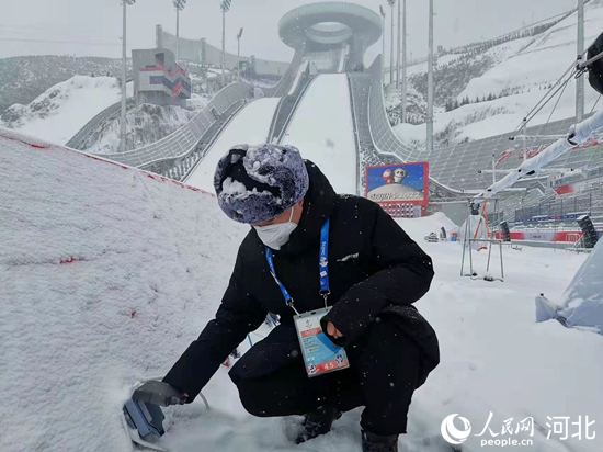 國家冬季兩(liang) 項電力保障團隊在暴雪中清理積雪,確保設備健康。 馬錚攝