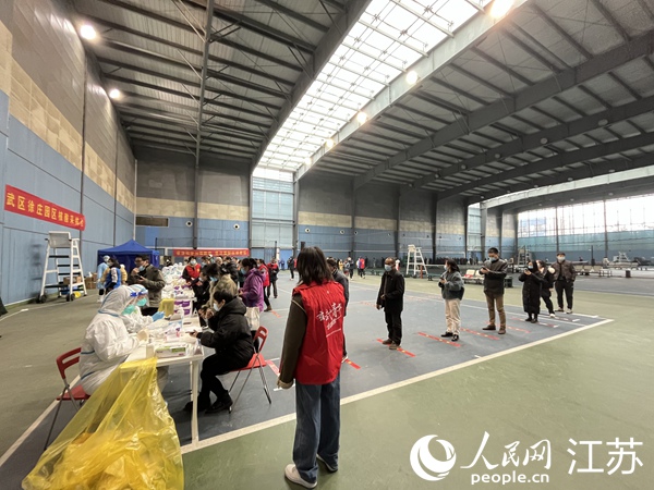 徐莊高新區體(ti) 育中心網球館臨(lin) 時集中檢測點,誌願者有序引導市民保持一米距離。人民網 李子佩攝