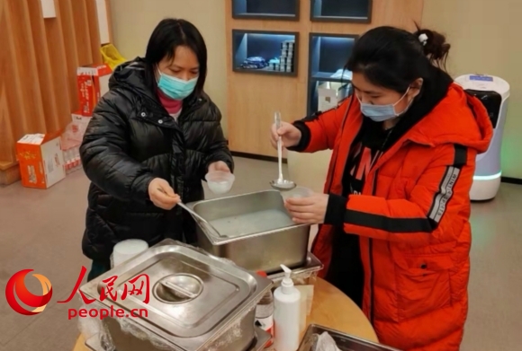 元宵節當天,蘇州市吳中區郭巷街道湖景花園社區為(wei) 隔離人員送上熱氣騰騰的湯圓。沈君攝
