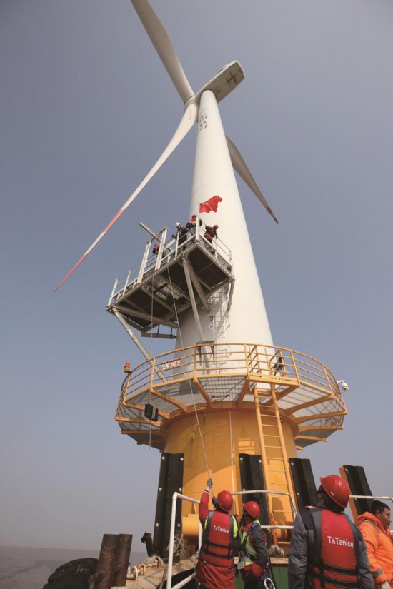 經過一個(ge) 多小時的航行,運輸船順利到達位於(yu) 風場最外圍的一台風機旁邊,一個(ge) 個(ge) 組裝好的設備“整裝待發”。在運輸船平穩靠近風機後,兩(liang) 名做好防護措施的施工人員率先爬上梯子,到達第二層風機平台後,兩(liang) 人迅速在護欄上固定好滑輪,與(yu) 運輸船上的施工人員相互配合,將所有設備“運輸”到平台上(見右圖 記者 江建華攝)。