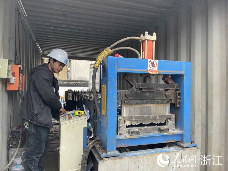 令狐偉(wei) 偉(wei) 正在操作機器壓製金屬屋麵板。人民網 王蕭蕭攝