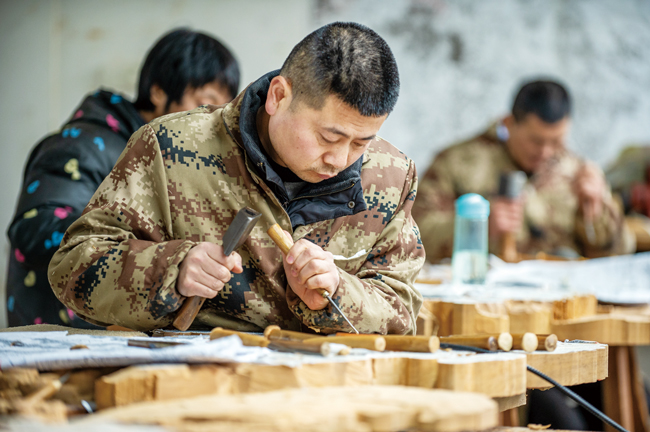 2月16日,金華東(dong) 陽市一木雕工坊裏,工匠在專(zhuan) 心製作大型木雕作品。春節過後,東(dong) 陽木雕企業(ye) 紛紛開工生產(chan) 趕訂單。(胡肖飛)