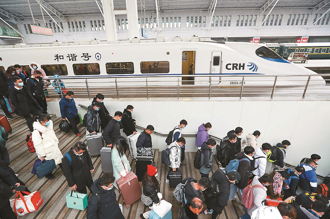 元宵節後,春運迎來最後一波返程客流高峰。交通運輸部門在切實保安全、保暢通、優(you) 服務的同時,加強執法監管,確保返程人員安全舒心出行。圖為(wei) 17日,旅客在鐵路南京站有序出行。本報記者 陳儼(yan) 攝
