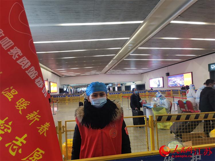 在蘇州火車站參與(yu) 誌願服務的熱心市民何群飛。人民網記者 王繼亮攝