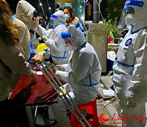 從(cong) 16日晚上開始,蘇州市第九人民醫院醫生白誌餘(yu) 拄著拐杖的照片在朋友圈刷屏。“請大家排隊時務必戴好口罩、保持防護距離、提前展示健康碼、降低感染風險......”他連夜加入核酸檢測誌願者隊伍中,拄著雙拐維持秩序,被居民們(men) 親(qin) 切地稱為(wei) “拐杖醫生”。