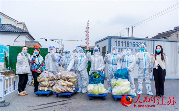 蘇州吳中區木瀆鎮愛心人士嚴(yan) 麗(li) 萍(右一)等為(wei) 管控區送上愛心蔬菜。木瀆鎮供圖