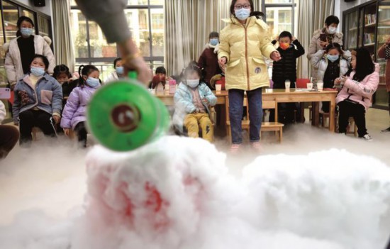 日前,嘉興(xing) 市秀洲區高照街道秀清社區請來科技館老師,將兒(er) 童科學實驗課堂搬到社區,讓孩子們(men) 在家門口就能上有趣又好玩的科學實驗課。(馮(feng) 玉坤)