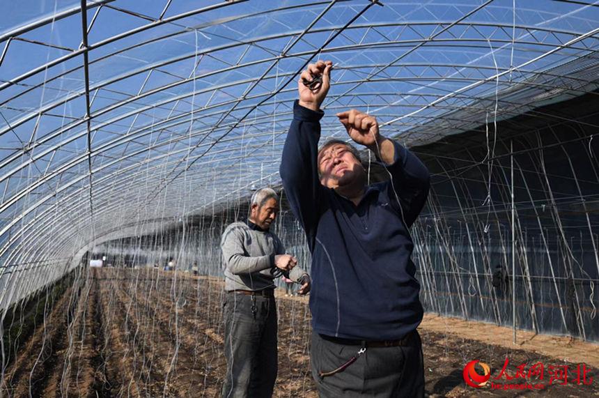 永清縣相輝果蔬農(nong) 民專(zhuan) 業(ye) 合作社,員工為(wei) 西瓜種植綁吊秧繩。劉欣羽攝