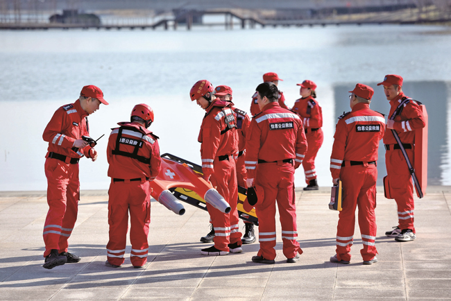 2月24日下午,在嘉興(xing) 秀湖畔,怡恩公益救援隊組織隊員開展應急救援訓練,以此提高隊員們(men) 的應急救援能力。(馮(feng) 玉坤)