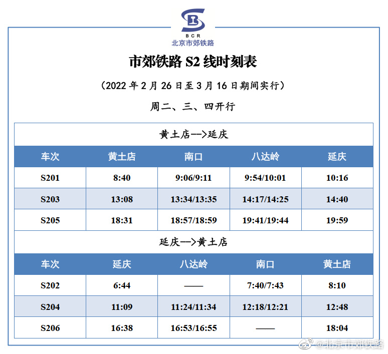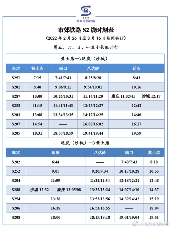 人民網北京2月25日電 據北京市郊鐵路官方微博消息,根據鐵路運輸調整通知,2022年2月26日至3月16日, S2線恢複周二、三、四3對/日,周五、六、日、一及小長假7對/日的列車開行方案,列車開行時點無變化,具體(ti) 列車時刻表如下所示。