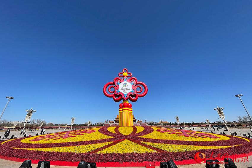 天安門廣場“精彩冬奧”主題花壇完成冬殘奧會(hui) 會(hui) 徽更換。人民網 尹星雲(yun) 攝