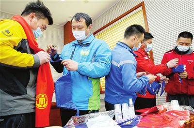 圖為(wei) 快遞小哥代表領取“暖心包裹”。 記者 吳迪 攝